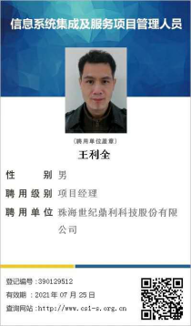 本公司聘請網(wǎng)優(yōu)技術(shù)顧問王利全工程師作為勘察設(shè)計(jì)人員,是公司有系統(tǒng)集成資質(zhì)的人員,并通過中國移動(dòng)廣東分公司的網(wǎng)優(yōu)資格考試!已登記的從業(yè)人員。以下是官方網(wǎng)站查詢結(jié)果:
